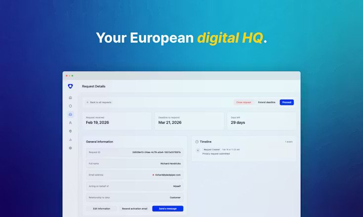 The company describes the product as “your European digital HQ in a box”, offering services such as EU regulatory representation, privacy and compliance automation, hiring infrastructure, and EU company formation.